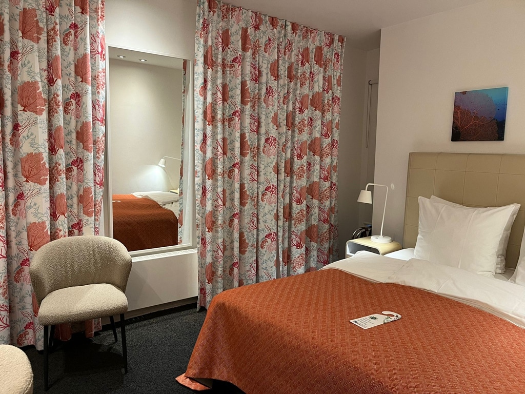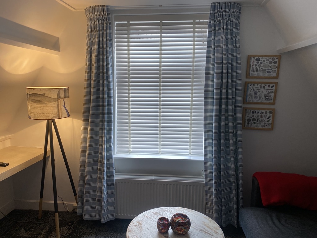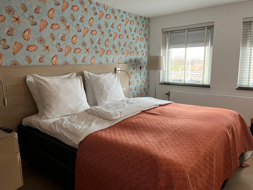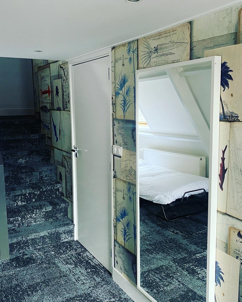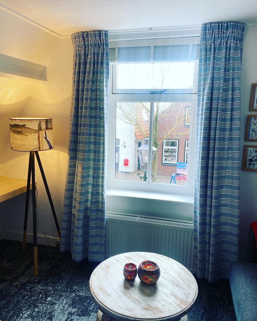 2 kamers kregen nieuwe gordijnen met stof van Thibaut. 1 van deze kamers was al aangepakt door er een mooi behang van Mind the Gap op verschillende muren aan te brengen aangevuld met lampenkappen van hetzelfde behang, speciaal voor t hotel gemaakt door Stout Verlichting.