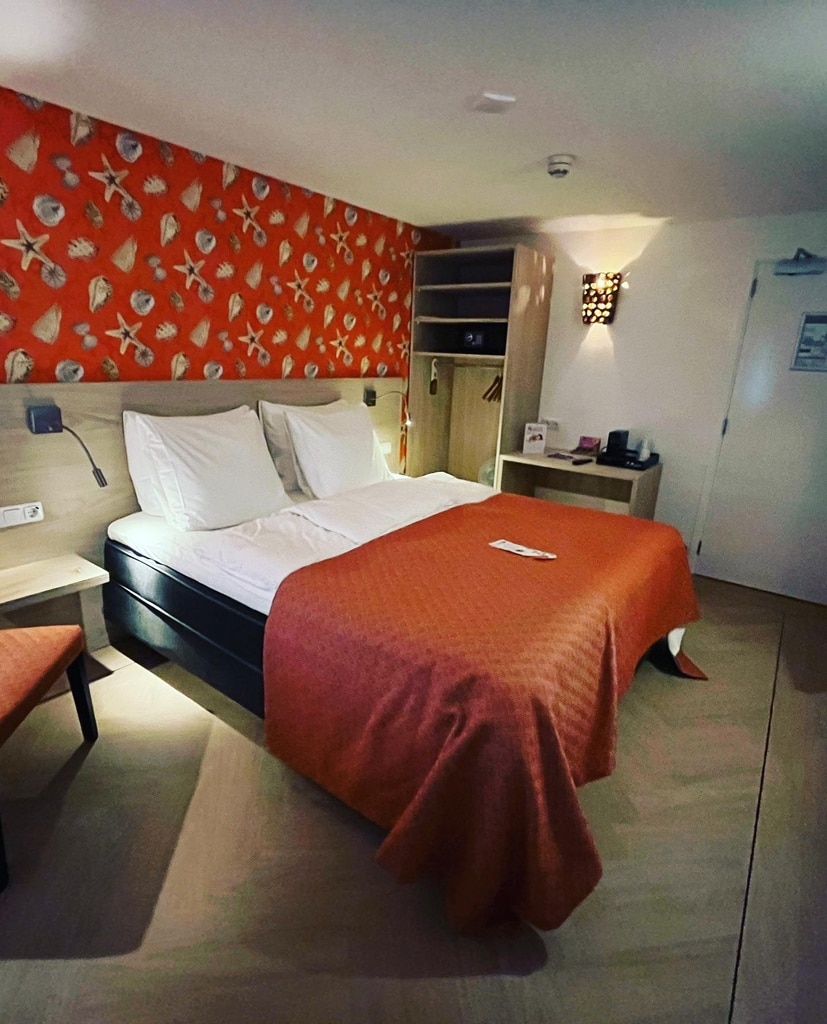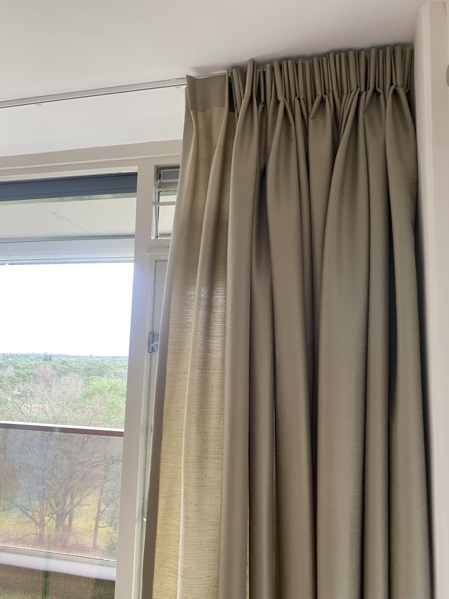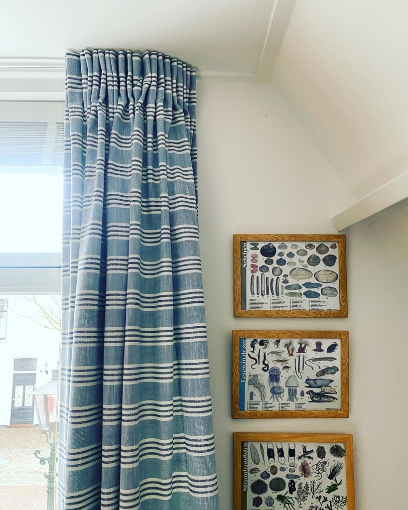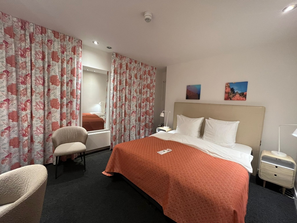 2 kamers kregen nieuwe gordijnen met stof van Thibaut. 1 van deze kamers was al aangepakt door er een mooi behang van Mind the Gap op verschillende muren aan te brengen aangevuld met lampenkappen van hetzelfde behang, speciaal voor t hotel gemaakt door Stout Verlichting.
