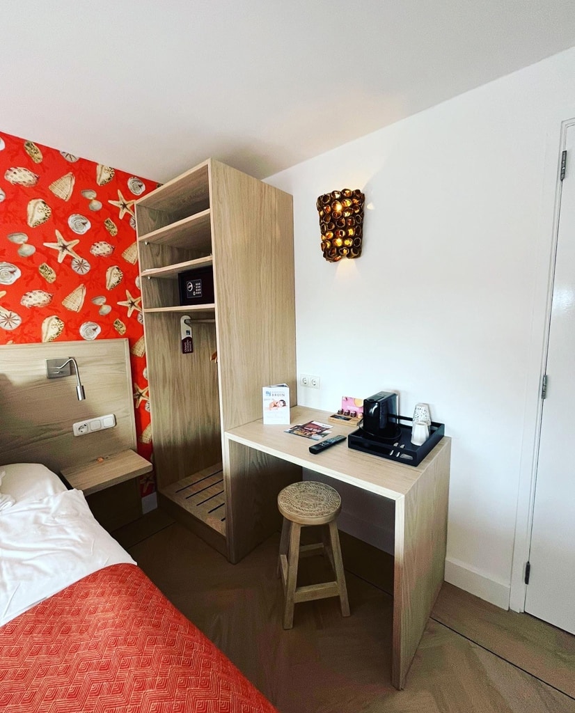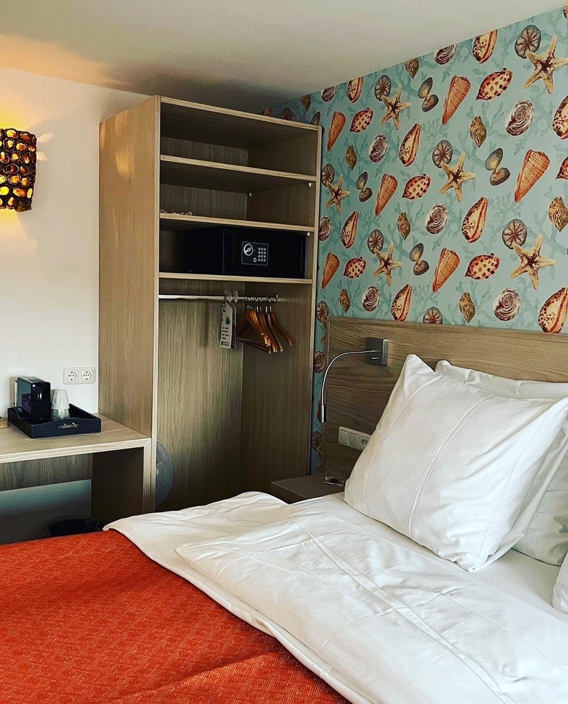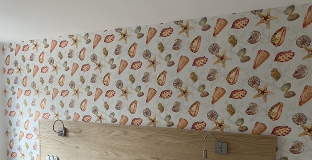 De meubels werden lichter en compacter gemaakt, een mooi behang van Thibaut met afbeeldingen van schelpen en zeesterren in 3 kleurstellingen werd op de muur achter het headboard aangebracht.